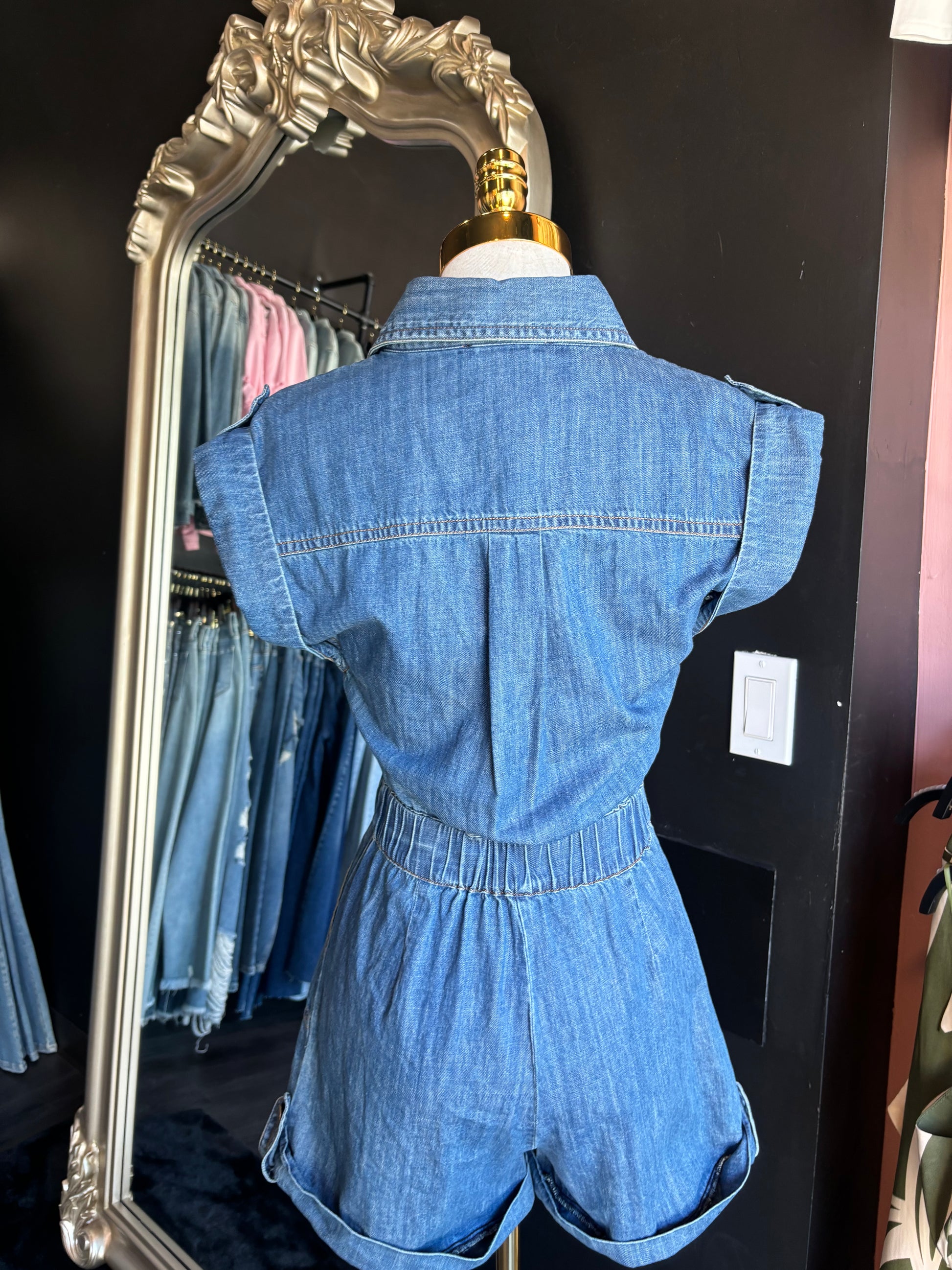Elevate your casual wardrobe with the Janet Romper, expertly designed as a chic jean romper shorts. Crafted for a perfect fit, this piece combines the relaxed comfort of shorts with the stylish appeal of a romper, ideal for warm days or layering. Its versatile denim fabric ensures durability and a flattering silhouette, making it a smart choice for effortless, polished looks. Runs tru to size